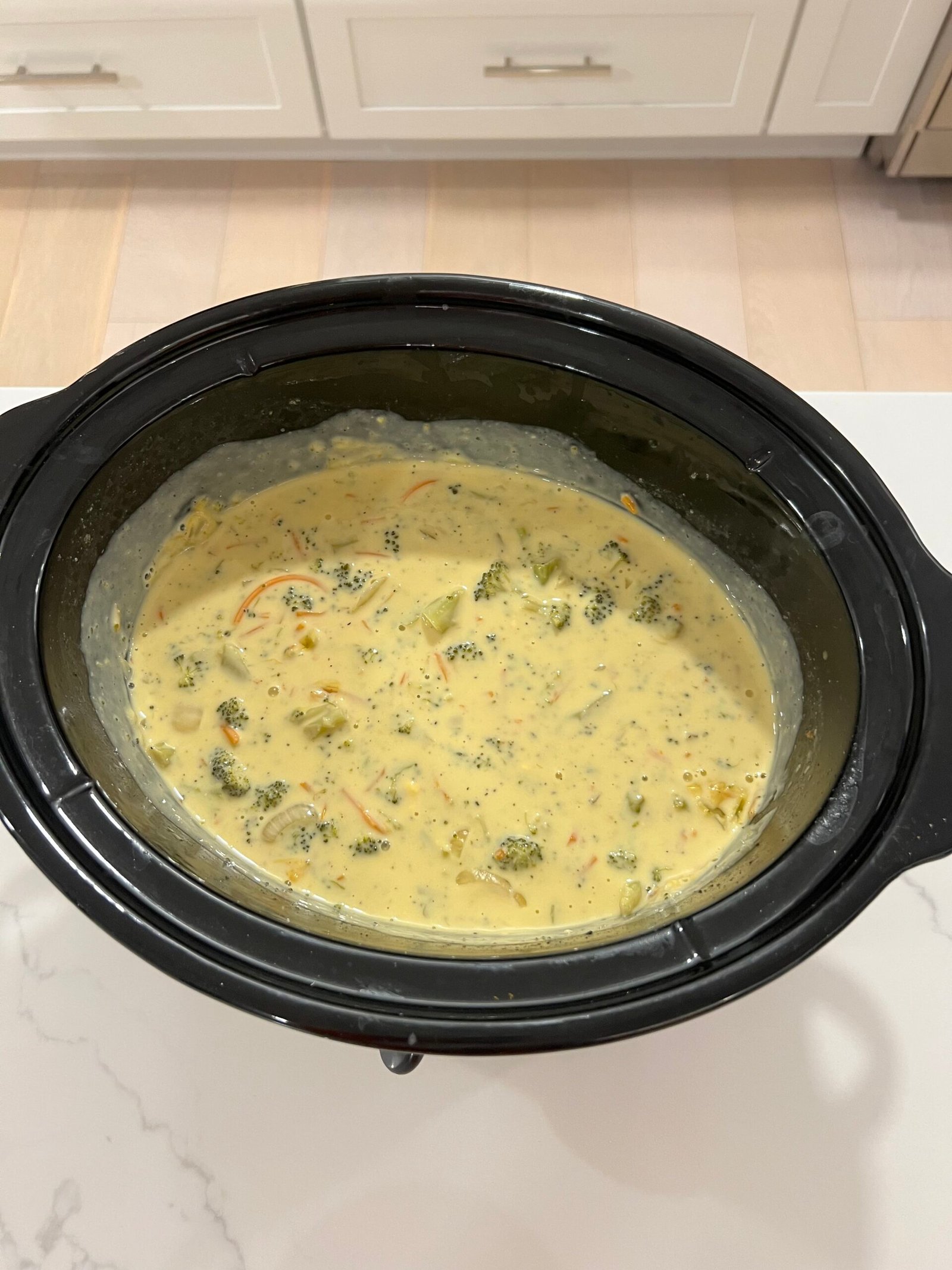 • Add in 6 cups of chopped frozen or fresh broccoli, 2 cups of carrots, 1 cup of diced white onion, 1 tablespoon of garlic powder, 1 teaspoon of black pepper, and 3 cups of chicken broth. Give that all a good mix.